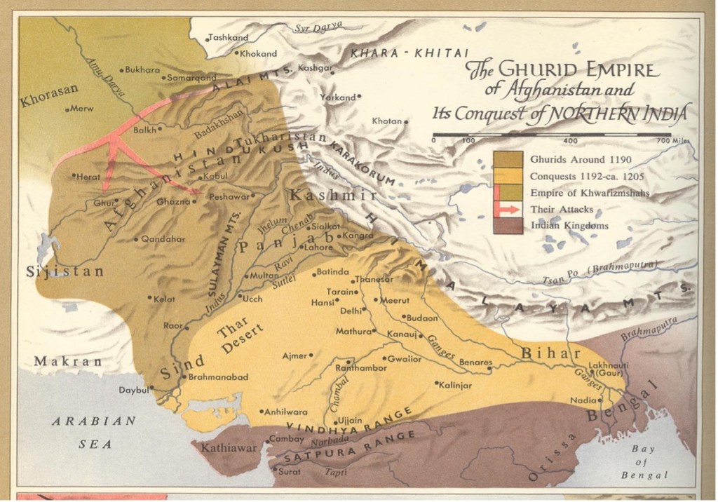 Stepping into this precarious arena and a volatile age, the Ghurid brothers inherited not an empire, but an opportunity. An opportunity to fill the vacuum left by fading powers and stalled ambitions; an opportunity that they did justice to by redrawing the political map—from Nishapur to Delhi, and from the Hindu Kush to the Ganges. From their highland capital at Fīrūzkūh and often clashing with the waning Seljuks and the rising Khwarazmians, Ghiyas-ud-Din consolidated power across Khorasan, extending Ghurid influence westward into Herat, Balkh, and the contested cities of Tus and Nishapur. Meanwhile, Mu’izzud-Din turned east towards the Indian Subcontinent. Piercing through the gates of Multan and subduing the Ismaili stronghold of Uchh, his defining moment came in 1186, when he extinguished Khusrau Malik, the last burning Ghaznavid lamp, in Lahore. With Lahore conquered and the Ghaznavid power wiped off the political map, the north of Hindustan lay open to him, only if there weren’t the Rajputs to give him a challenge. The Rajputs headed by Prithviraj Chauhan met the Ghurid forces at Tarain (modern day Haryana, 110 kilometres north of Delhi) in 1191, and repulsed the Ghurids back enough for Mu’izzud-Din to review his strategy and wait another year to launch a solid attack. in 1192, when the Ghurids reappeared they tilted the balance of power in Hindustan forever.