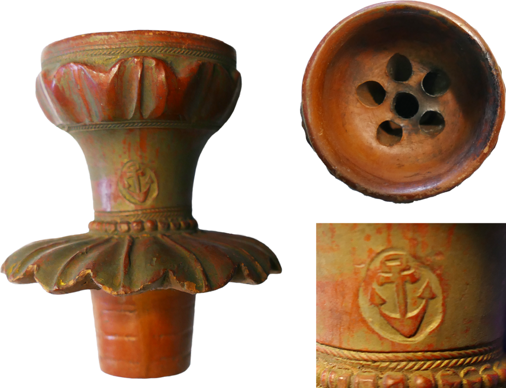 Tophane pipes display distinctive technical and stylistic features. Typologically, they can be grouped into major categories based on the shape of the bowl. One common form is the ovoid or pear-shaped bowl, which was particularly prevalent during the 18th and 19th centuries. These pipes were often adorned with relief motifs such as palmettes, rosettes, wave patterns, and occasionally religious or honorific inscriptions. Another widespread type features a flared cylindrical form, generally simpler in design and more closely associated with mass production. Some pipes bear maker’s stamps, molded on the side of the bowl or under the base. These often include the artisan’s name, sometimes preceded by the phrase amal-i (“made by”), and are invaluable for studying production chronology and organization. Known stamps include names such as Mehmet, Ali Usta, Hasan, and Tophaneli İsmail (Bakla, 2007). Pipes were frequently finely polished, giving them a shiny appearance. They were then slip-coated for decorative effect or increased impermeability. Tophane pipes were renowned for their durability and aesthetic appeal, which explains their wide distribution throughout the Empire.