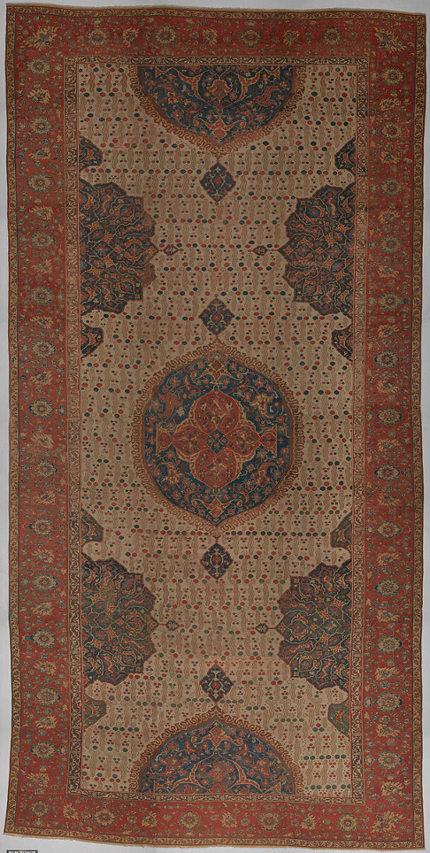 Although Mamluk Cairo fell to the Ottomans in 1517, the city continued to be a major center for artistic production. Using the same materials and techniques as earlier Mamluk carpets, Ottoman court carpets such as this were produced in Egypt for export, primarily to the Ottoman court in Istanbul. The immense scale of this carpet’s drawing suggests it once formed part of an even larger carpet.