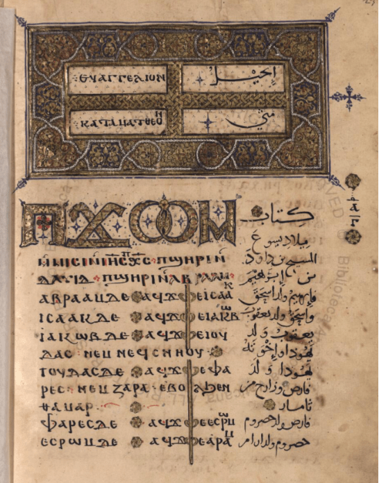 One of the most beautiful Bohairic-Arabic manuscripts is preserved at the Vatican Library. This bilingual, dating from the thirteenth century, displays exquisite calligraphy. In the illustration of the opening of the Gospel of Matthew, the Coptic text takes centre stage and occupies far more space than the Arabic. Intriguingly, the scribe linked the Coptic letter ⲫ of the recurring word ⲁϥϫⲫⲉ ‘he begot’. The Arabic is written in a very neat naskh-type calligraphy and is provided with vowel markings.